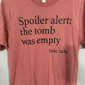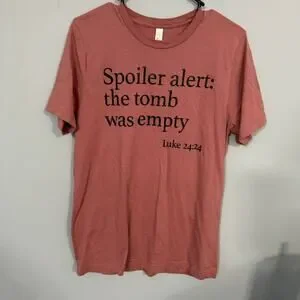 Bella + Canvas "Spoiler Alert: The Tomb Was Empty" Tee Shirt in women's Size Medium. Luke 24:24. Short sleeves. 100% cotton. Worn once and washed twice. Shirt is in very good used condition with no flaws or stains and minimal wash wear. Please see close-up pictures for condition details. Pit to pit measures approx 19 in across & length from top of front shoulder to bottom hem measures approx 27.75 in. Jesus. Christian. Christ. Church. Easter. Religious.