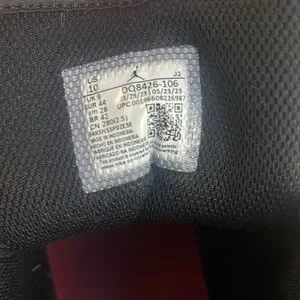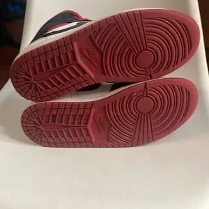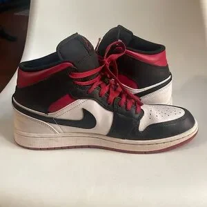 Classic Nike Air Jordan sneakers. Features black, white, and red colors. Iconic design with high-top style.