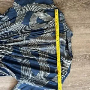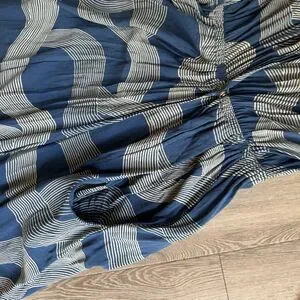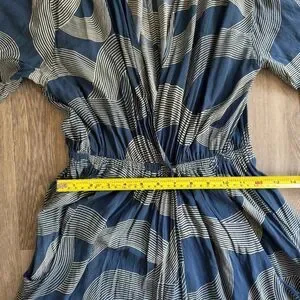The Dress Forum Los Angeles Boho Hippie Wrap Dress in blue and white is a stylish and versatile piece perfect for various occasions. This V-neck maxi dress features a unique abstract pattern, long bell sleeves, and a wrap closure for a comfortable fit. Made from a blend of polyester and rayon, this dress is ideal for travel, parties, casual outings, and more. The bohemian, hippie-inspired design with elements of retro and colorful themes makes it a standout choice for the summer, fall, and spring seasons. Size small regular for a flattering fit.