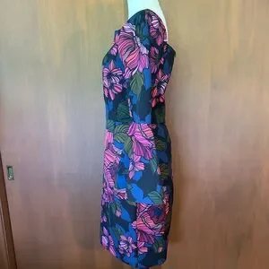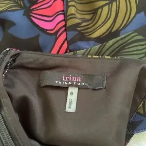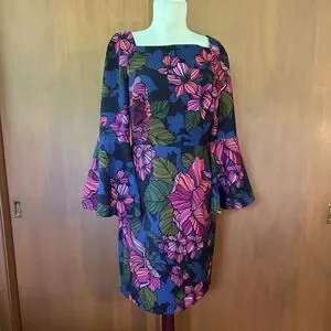 Trina Turk dress with bold floral design. Features vibrant colors and stylish pattern with bell sleeves and square neckline. Size 6, approximate measurements 36” length, 17” across chest