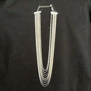 Silver tone multi chain cascade necklace with mixed strands of different link styles, beaded, snake, etc