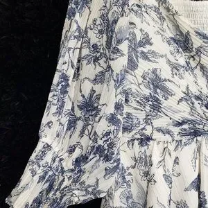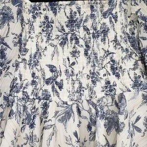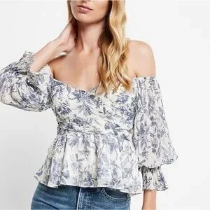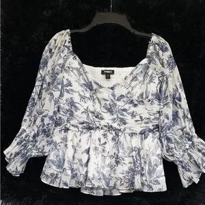 Elevate your style with the Express White and Blue Ruffled Peplum Blouse, featuring elegant 3/4 sleeves. This top showcases a sophisticated blend of ruffled details and a flattering peplum silhouette, perfect for any occasion. The harmonious white and blue color palette adds a timeless touch to your wardrobe.