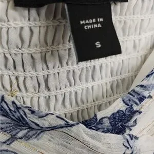 EUC Express White Blue Ruffled Peplum Blouse Metallic Gold Shimmer Size Small