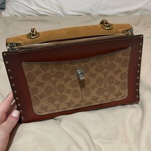 Genuine leather Coach Parker bag. Super stylish and adjustable strap on this beauty. So much space and holds a lot more than you’d think. The inside is a suede-like material that is super soft. Mostly gold hardware with the occasional silver in the flower detailing on the front. Perfect for a night out or casual day with friends.