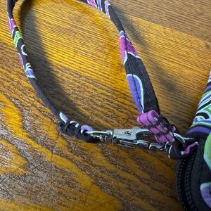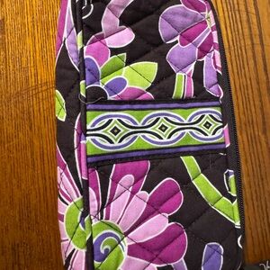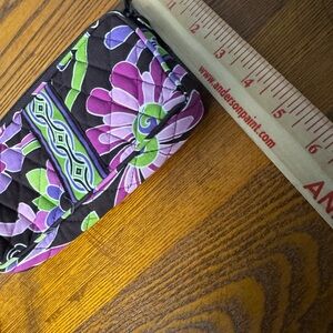 This Vera Bradley wristlet showcases a captivating floral design with a black base and vibrant purple accents. 7” x 4” ~ Like New