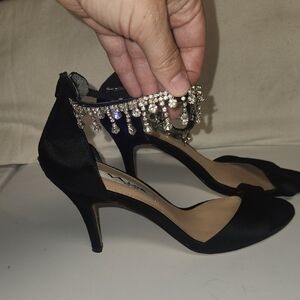 Sophisticated black heels featuring a dazzling crystal ankle strap. Perfect for special events. missing one gem shown in the last picture.