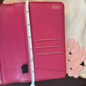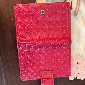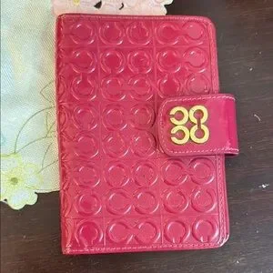 Stylish red wallet with embossed design. Features gold logo detail. Snap closure for security.