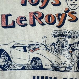 Pit to pit 16.5”. Length 20.5”. “Toys for Leroy’s Boys Car Show July 21st, 1985”. 50/50. Some faint stains on the front. Not noticeable. See photo.