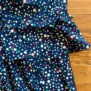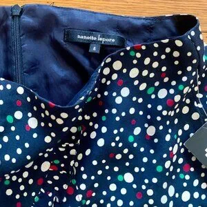 Nanette Lepore Whisked Away navy blue silk mini skirt with tiered asymmetric ruffles and white, red and green polka dots and a back zip closure. 100% silk with acetate lining. Light, cute and flirty - great for spring, summer and parties. Zipper closure.