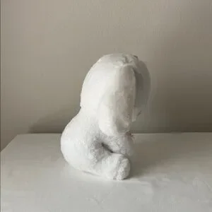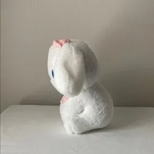 Adorable Look-a-like Sanrio Cinnamoroll plush. Features soft white fur. Pink bow and scarf add charm. Blue embroidered eyes and mouth.