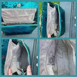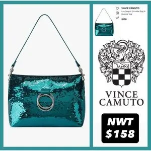 NWT $158 Vince Camuto Shimmery Sequined Shoulder Bag. Is it a dark teal? An emerald green? I’m not sure what Pantone says, but the color is GORGEOUS! Its royal pizzazz 👑 I took pics in multiple lighting so you can get the best idea 🤩