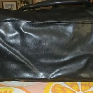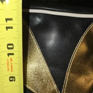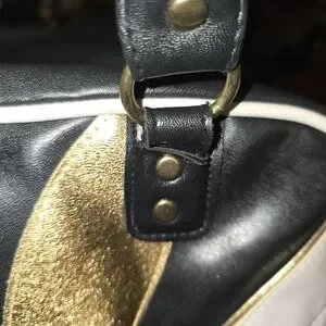 Stylish tote bag featuring a striking gold and black design. Perfect for adding a touch of elegance to any outfit. LG bag with a light line mark on back k of bag as seen in pictures