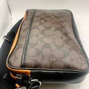 Stylish and functional, this RARE COACH men's multi-compartment travel bag features a sophisticated brown, burnished yellow and red leather design, featuring the iconic COACH C’s in the walnut brown pattern. Perfect for everyday use, or travel, it truly