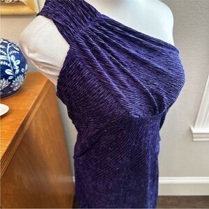 The Dress comes fully lined, featuring one-shoulder styling and a front slit detail. It includes a concealed side zipper closure. The main fabric comprises 52% metallized fiber and 48% polyester, while the lining is composed of 100% viscose. It is recommended to hand wash this garment.