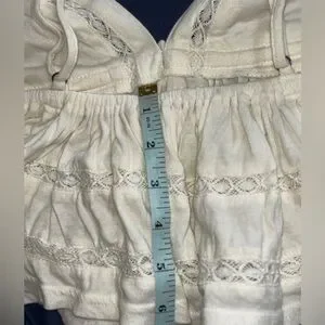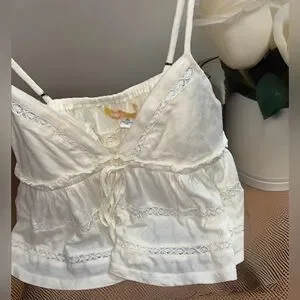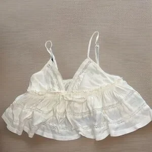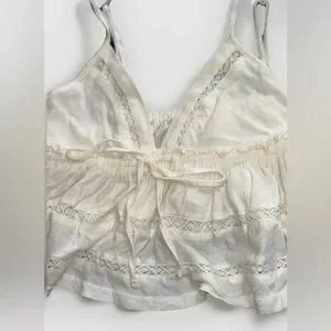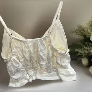 Elegant cream top with intricate lace accents. Perfect for layering. The Urban Outfitters Nia Babydoll Cami in Ivory is a stylish and lightweight top perfect for summer and spring. This sleeveless camisole features a V-neckline, pullover closure, and delicate crochet accents with a bohemian theme. Made of breathable cotton knit fabric, this babydoll cami offers a comfortable fit with a regular size S and spaghetti strap design. Ideal for travel and casual occasions, this ivory top adds a touch of feminine elegance to any wardrobe.