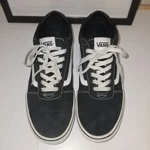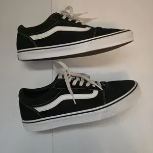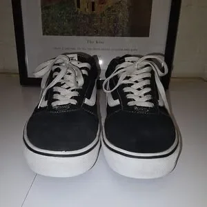 Pre owned VANS in black suede and white leather. These were my sons. I'd say they are in fair to good condition. Please see all photos and request more photos if needed. No smells of any kind.