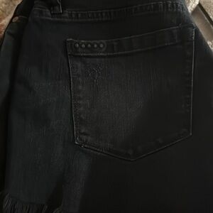 Chic dark blue Jean shorts with fringe hem. Ideal for casual wear. These have front and back pockets. These have some stretch