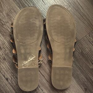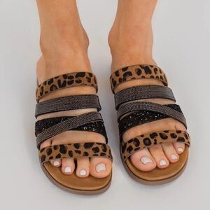 Very G Ginger/Roya Sandals, adorable 5-strap sandals with metallic studded, glitter, and leopard print calf hair details, thick sole for a bit of lift and support, straps are not adjustable, fit true to size, slide on styling.