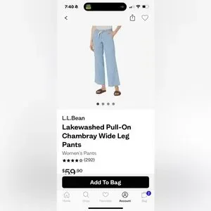 L.L. Bean Lake Washed Pull On Chambray Wide Leg Pant 26W