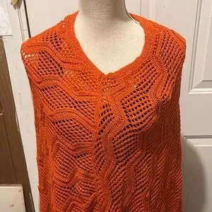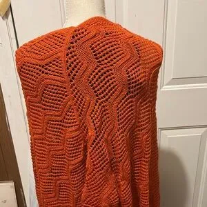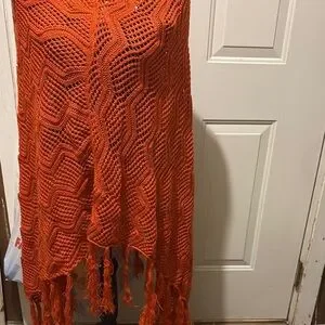 Eye-catching orange knit shawl with a chic fringe. Ideal for a vibrant touch to any ensemble.