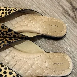 Experience the perfect blend of style and comfort with Birdies' tan and black mules. These slip-on shoes feature a striking leopard print pattern, making them a standout addition to any outfit. With a flat sole and a luxurious textured finish, they offer both elegance and ease for any occasion.