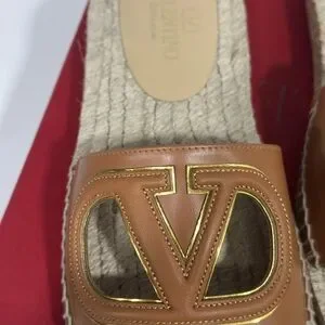 Elegant tan espadrille sandals by Valentino Garavani. Features signature logo detail. Perfect for casual elegance.