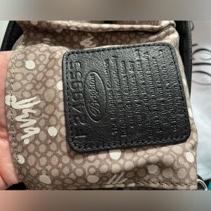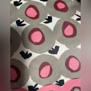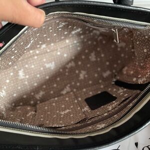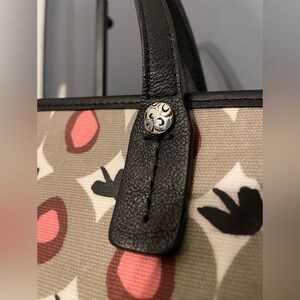 Brighton Loves Vera collab tote bag that is no longer sold in stores. Stunning shades of pink, black and grey canvas exterior trimmed with black leather accents and leather tote straps. Features a zip top closure. Original Brighton heart hang charm shows some tarnishing but is still present and beautiful. Interior lined with a fun fabric lining with 2 open slip pockets, 2 zipper pockets, and a key lanyard.