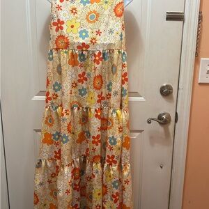 Embrace vibrant style with this floral maxi dress. Featuring a lively orange and cream pattern, it's perfect for any occasion. Enjoy comfort and elegance in one stunning piece.