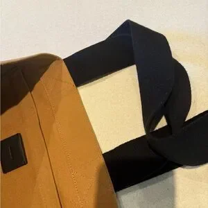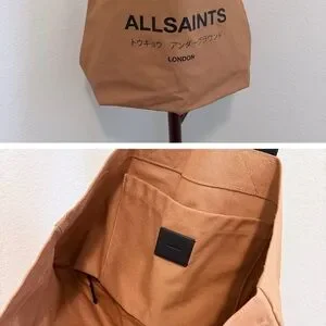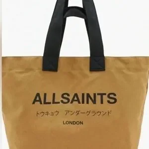 The All Saints Black and Tan Canvas Tote Bag embodies a minimalist design with its sleek urban aesthetic. Crafted from durable canvas, this bag features sturdy black handles and a prominent All Saints logo, making it a stylish choice for everyday use. Its clean lines and modern look reflect the brand's commitment to quality and fashion-forward design.