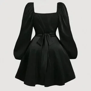 This sophisticated black dress from SHEIN features a flattering fit and flare silhouette with a peplum waist and ruched detailing. The long bishop sleeves and sweetheart neckline add a touch of elegance, making it perfect for a cocktail event or a night out.