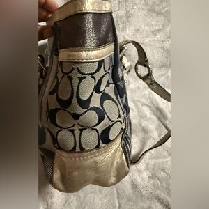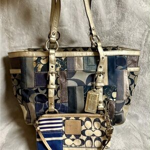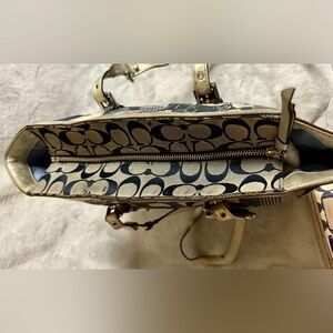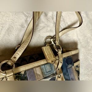 Coach Vintage Patchwork Beige Brown Tote Hand bag Tote Bag Used Women From Japan , Stylish patchwork tote bag with a mix of blue, brown, and cream tones. Perfect for adding a unique touch to any outfit.