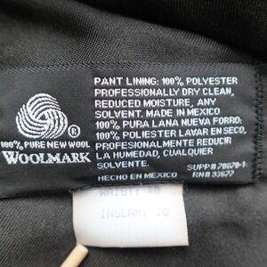 Pants are pleated with a satin stripe down the outer seam, two front and two back pockets, button tab and zipper fly. Tag size is Waist 40, Inseam 30.