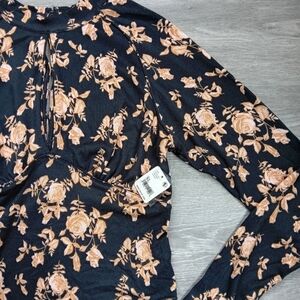 Free People Dinner Party Long Sleeve Black & Cream Floral Print Keyhole Cutout Stretch Knit Top