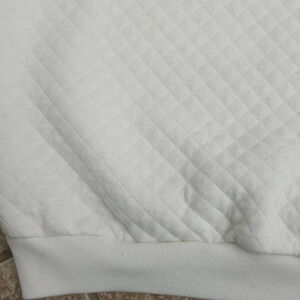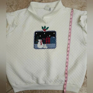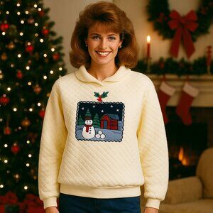 Vintage 80s Jantzen quilted white pullover sweater featuring a charming snowman and village patchwork design with holly detail at the neckline. Cozy diamond-quilted texture and soft cotton blend make it perfect for chilly days or festive holiday gatherings. There are visible stains and discoloration on the front, sleeves, and collar (see photos) — still an adorable and rare retro piece with tons of charm.