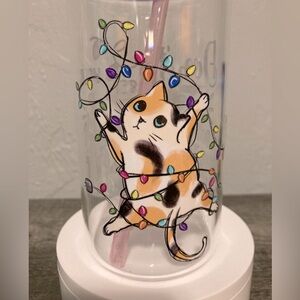 Handcrafted by myself with love ❤️. Graphic 16oz glass tumbler. Cat tangle up in Christmas lights- Don’t Get Your Tinsel in a Tangle. Super cute for the holiday. Comes with sparkling lid, straw, and straw cleaning brush.