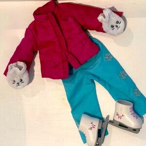 Super cute ice skating outfit- puffy coat, mittens, sparkly snowflake pants and ice skates