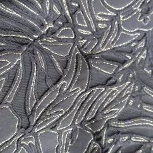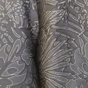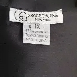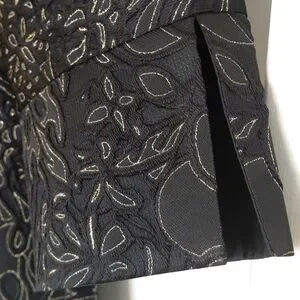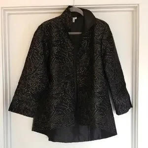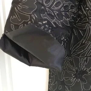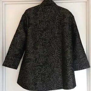 I got this floral jacket at the Kennedy Center gift shop, and only wore it once so it's in like new condition with no flaws or imperfections. Size XL. The black background is embroidered with gold thread. It is fully lined in black. It has an open front, measuring 28 inches long in the front and 32 inches in the back. The sleeves are 21 inches long and can be rolled up about 4 inches. It has a stand up collar that can be folded down. The material is 52.8% nylon and 47.2% polyester. Dry Clean only.