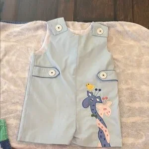 This charming romper from The Beaufort Bonnet Company showcases a delightful giraffe embroidery in blue and yellow hues. Its classic design offers a playful touch, making it a standout piece in any wardrobe.