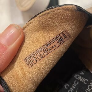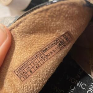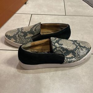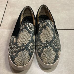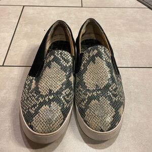 Vionic woman slip on tennis shoes. The shoes have a snakeskin motif on the front and a black suede in the back. These shoes are super cute and in good condition. They are a woman’s size 10
