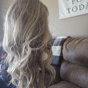 Enhance your look with these stunning blonde wavy wig. layers added. approximately 26" long. fun project wig. Standard cap.