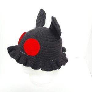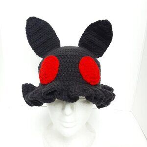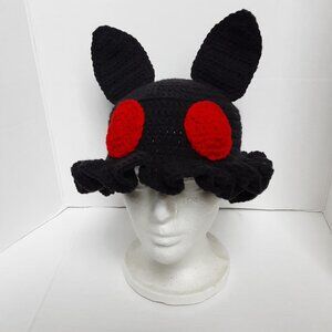 Embrace your mysterious side with this one-of-a-kind handmade crochet Mothman hat! This unique bucket hat features prominent ears and striking bright red crocheted eyes, perfectly capturing the iconic look of the legendary cryptid. Crafted with soft black yarn, it's comfortable for everyday wear or as a standout piece for Halloween, conventions, or just to show off your love for the unexplained. A perfect gift for cryptid enthusiasts, horror fans, or anyone who loves quirky, handmade accessories."