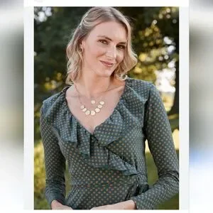 The Matilda Jane Long Sleeve "Reunion" Wrap Dress features an elegant design with long sleeves and charming ruffles, perfect for any occasion. Its green hue adds a refreshing touch to ant season, while the wrap style ensures a flattering fit. This dress combines comfort and sophistication, making it a versatile addition to any wardrobe.