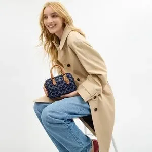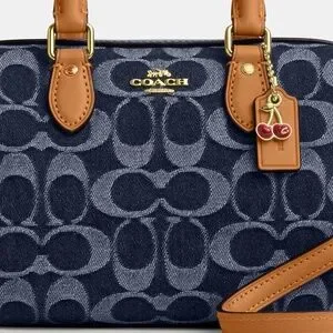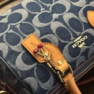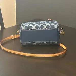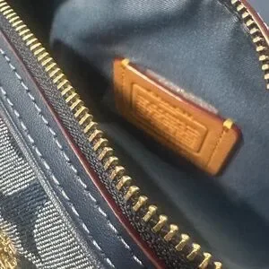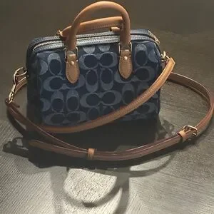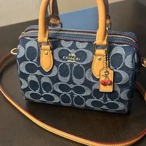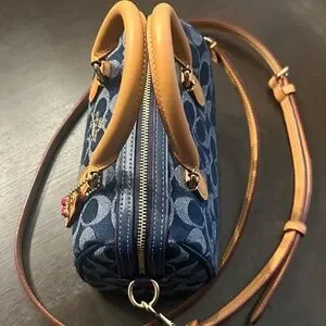 NEVER USED. Signature denim and vachetta leather Two credit card slots Zip-top closure fabric lining Handles with 2 3/4 drop Detachable strap with 23 1/2 drop for shoulder or crossbody wear 7 (L) x 4 3/4 (H) x 4 (W) Exclusive of trim this denim style is crafted of cotton sourced from farms that use regenerative agricultural practices—those that help to maintain and rejuvenate land increase biological diversity and soil health and could lead to increased carbon absorption Style No. CY742