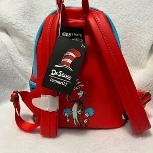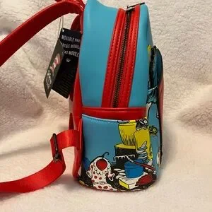 Playful mini backpack with Dr. Seuss characters. Features bold red, blue, and black design. Ideal for fans.