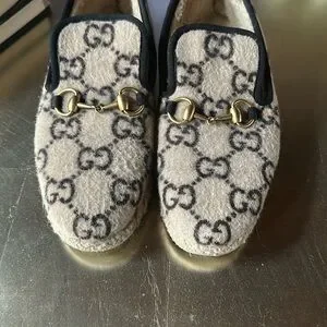 Stylish Gucci loafers in beige with black GG pattern. Features gold horsebit detail. Perfect for a chic look.