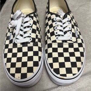 Classic Vans sneakers with a black and cream checkerboard pattern. Features white laces and soles.