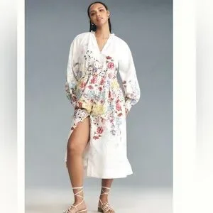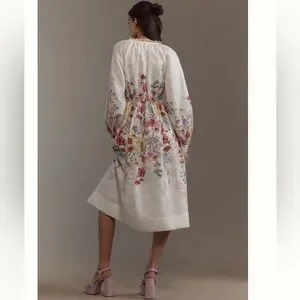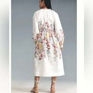 Elegant white dress with vibrant floral patterns. Features a flattering midi length and long sleeves. Perfect for any occasion.