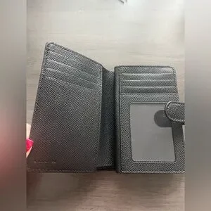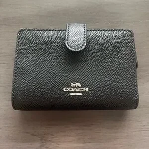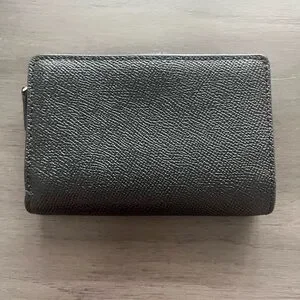 Sleek black leather wallet by Coach. Textured design with a secure closure.