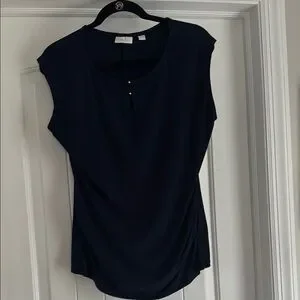 This chic black blouse from New York & Company features a fitted silhouette with cap sleeves and a buttoned front, making it a versatile addition to any wardrobe.