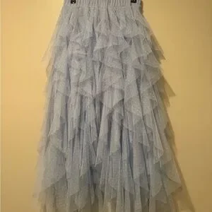 The Altar'd State Blue Bubble Midi Skirt is a stunning piece designed for prom or cocktail occasions. Featuring a tiered and ruffled style, this skirt offers a voluminous and ethereal look with its cascading layers. The soft blue hue adds a romantic touch, making it a standout addition to any wardrobe.